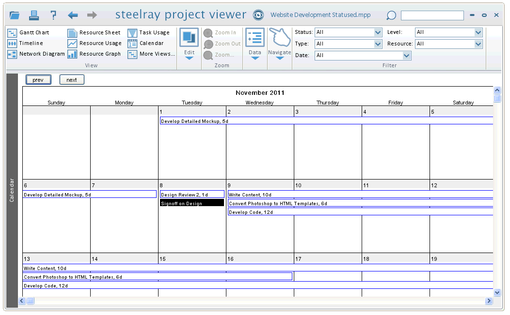 The Calendar View displays one month at a time. Tasks are represented by bars (with Task Name and Duration) spanning one or more days. Clicking prev or next in the upper-left corner changes the month shown. Milestone Tasks are displayed with a black background and white text. To see a complete list of Tasks for a certain day, click that day in the View, and a list of those tasks will appear.