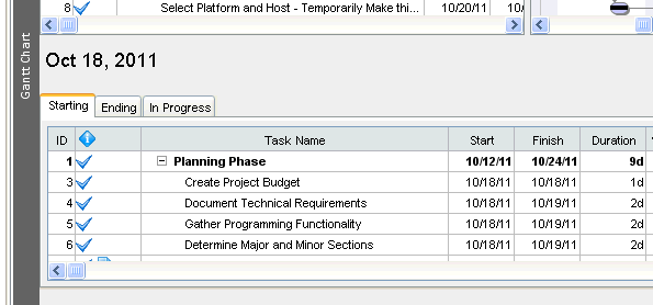 There are three tabs in this view: Starting (default tab), Ending, and In Progress. Selecting the Starting or Ending tab will show all tasks starting and ending, respectively, for the selected time period. Selecting the In Progress tab will show all tasks in progress (including starting and ending) for the selected time period.