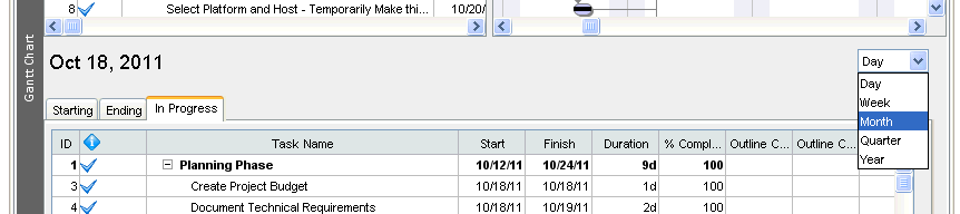 The right side displays information by time period for the corresponding line on the left side of the View. Zooming In and Out works as it does in the Gantt View. There are five levels, and each column represents a different time period in each zoom level.
