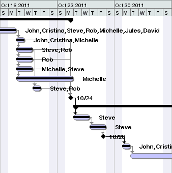 You can Zoom In and Out (using the menu or the toolbar icons) to change to a different time scale. This is the Weekly view. The top of the chart shows a timeline broken down by week and showing individual days. The tasks Start and Finish Dates are indicated by the beginning and end of the lavendar bars (task bars). Percentage complete is shown by the black line running through the task bar. To the right of each task bar are the Resource Names. This is a preference and can be changed in the Preferences Dialog. The arrows indicate the relationship between two tasks. Weekend days are shaded in this view.