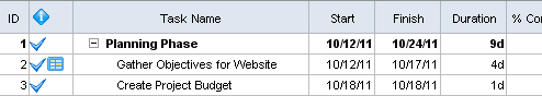 This area contains tabular data about each task. The schedule type will determine the columns visible by default. For a Microsoft Project schedule (.mpp) the default columns will be Task ID, Indicators, Task Name, Start, Finish, Duration, Percent Complete, and Resource Names. For a P6 XER schedule (.xer) the default columns will be Indicators, Activity ID, Activity Name, Baseline Duration, Remaining Duration, Start, Finish, Resource Names, and Total Slack. Tasks are organized in a hierarchical manner. For example, in this sample project, "Gather Objectives for Website" is a sub-task of "Planning Phase" (see screenshot, below).