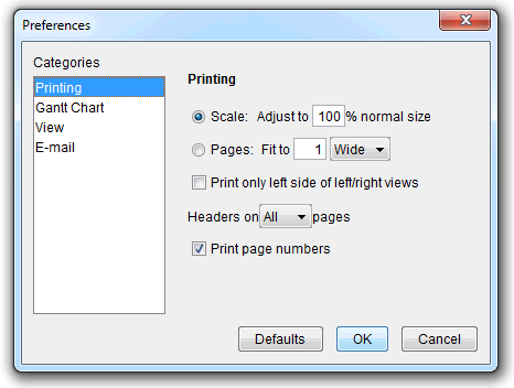 There are four categories: Printing, Gantt Chart, View, and E-mail.