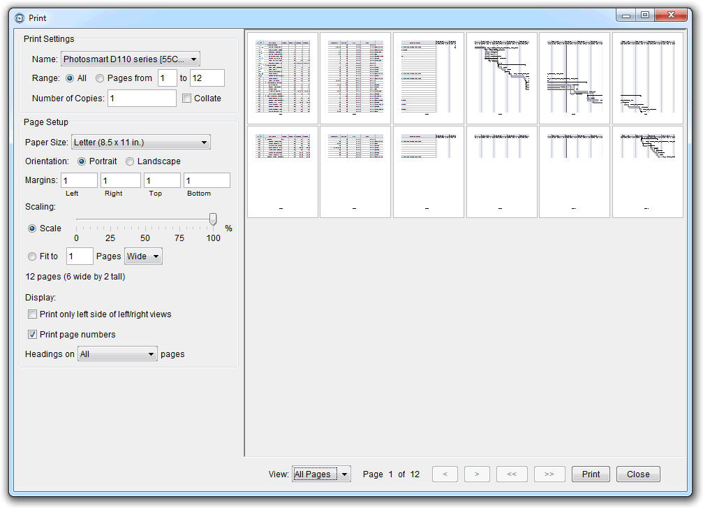 Headers: Select All (default) to see the Gantt Chart Header (date information) on all pages. Select Top to see the headers on the top pages only. Ex. If the printout is 3 pages wide by 4 pages tall, printing headers on Top pages will result in the headers being printed on the first 3 pages only.