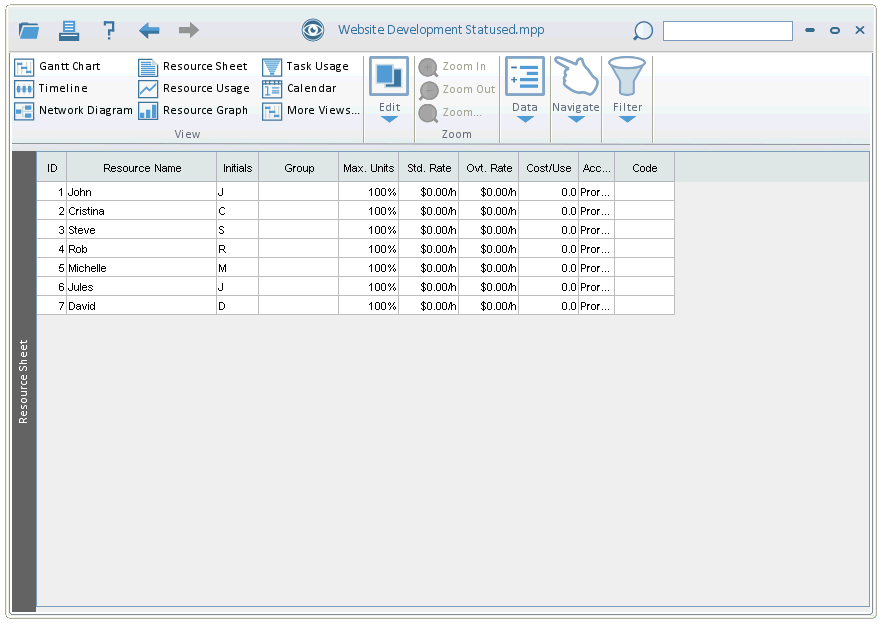 The Resource Sheet View displays information specific to each Resource. In this View you see each Resource's Name, Initials, Group, Rate, etc...