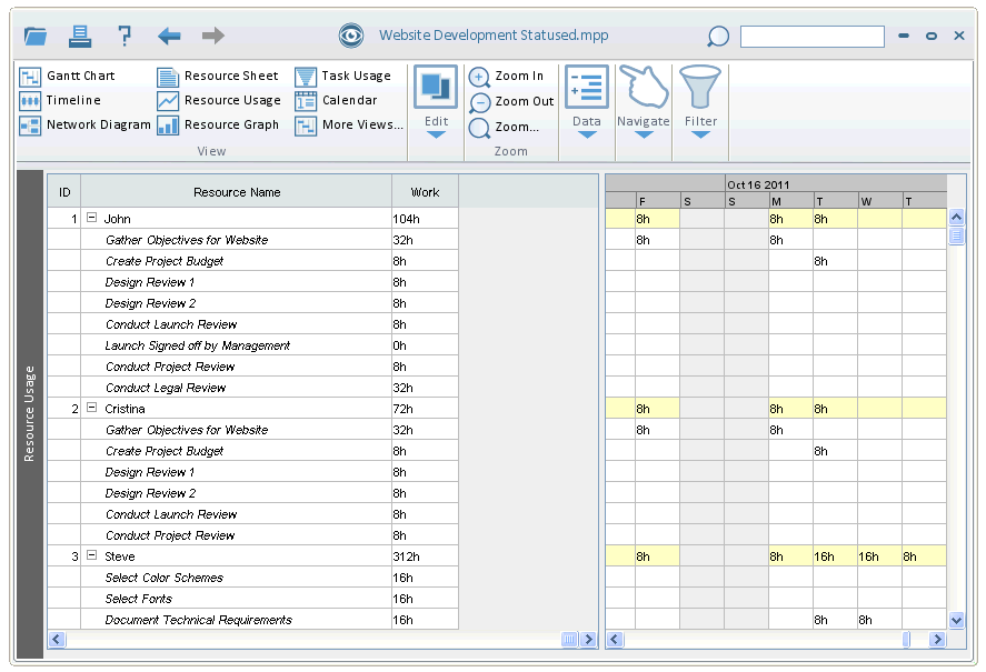 The Task Usage View displays information about each Task as it relates to the assigned Resources.