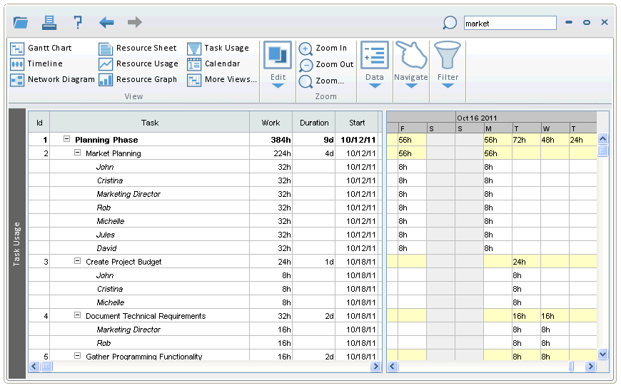 Just type in a word, name, or date in the Search text box, click Search (or press Enter), and you'll see all results related to your search organized by category. The text search is case-insensitive. In the example below, searching for 'market' finds two categories of results: Resources and Tasks. One Resource has the word 'market' in it, which is highlighted. Six tasks have the phrase (to see the Tasks, click the Task (6) link on the left). To search on a date, the date must be entered in the format selected in the Preferences Dialog.
