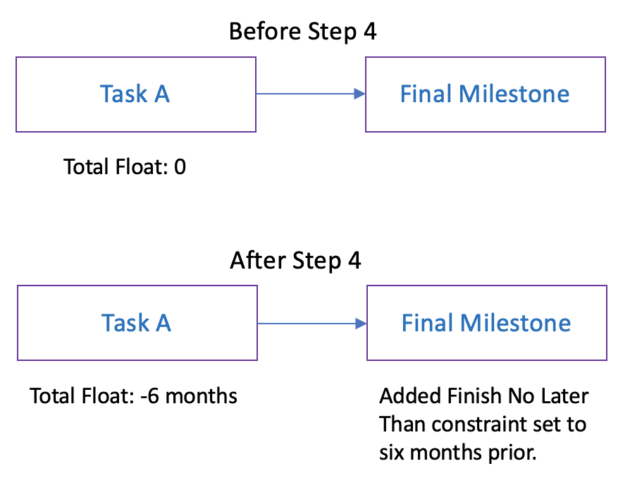 By removing the hard constraints in the second step, you are stripping the schedule down to its purest form; boxes and arrows that make up the schedule network. Step 4 (adding the “finish no later than” constraint) is the key. In this step, you’re finding the true longest path in the network. The group of tasks that shares the least (most negative) total float is on the longest path.