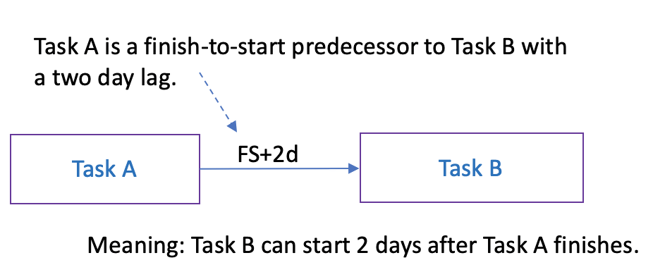 Suppose that Task-B is a finish-to-start successor to Task-A. As such, Task-B can start after Task-A finishes. When it’s appropriate, the scheduler can add a lag to their relationship. If the scheduler wants two days to elapse after Task-A finishes before Task-B starts, they would add a 2-day lag to the FS relationship. A lag is essentially a waiting period.