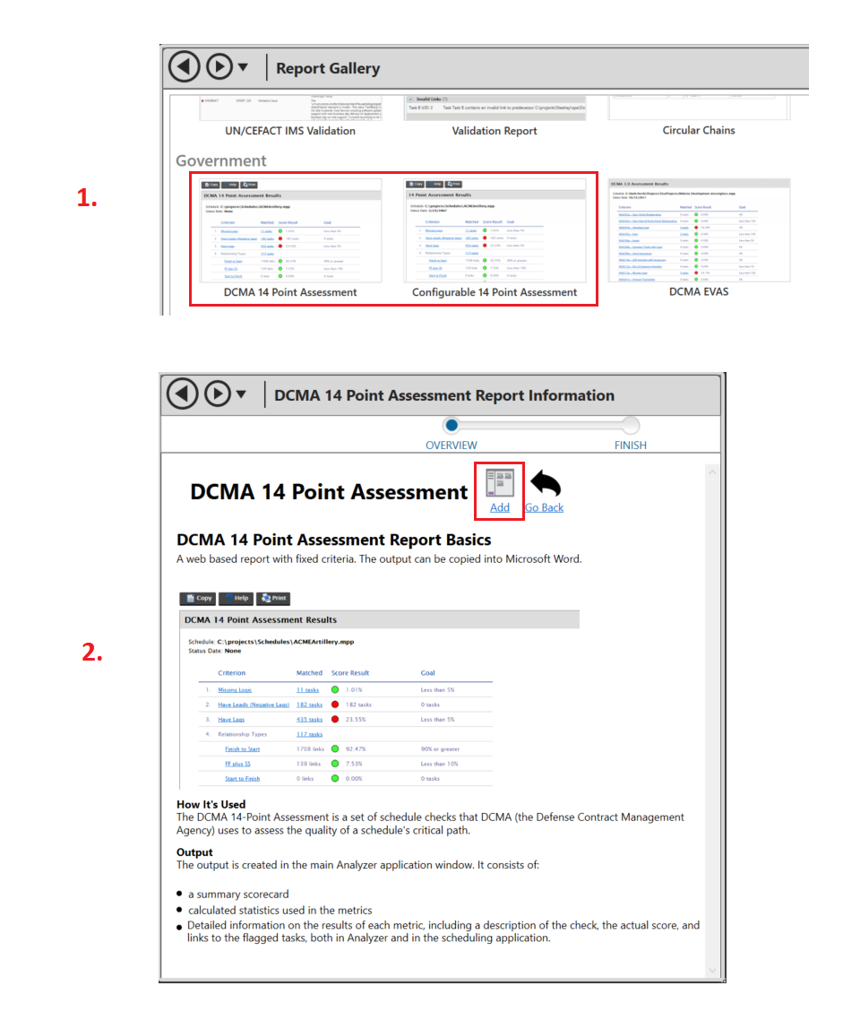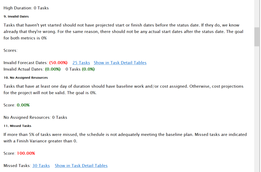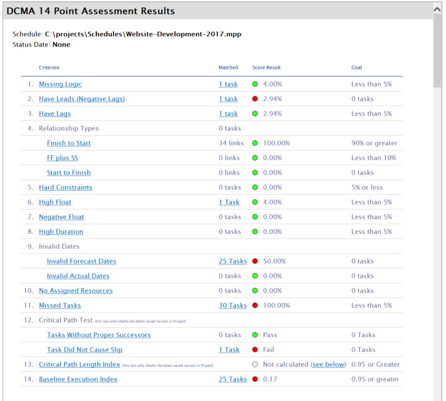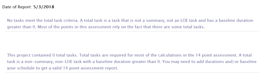 The 14 point assessment requires that a few things are done to prepare the schedule. First, the schedule must be baselined. The schedule must have a status date. Non LOE tasks should have baseline durations greater than zero. If there is no baseline, the tool will not produce a report. If tasks are missing baseline values, we will produce a warning.
