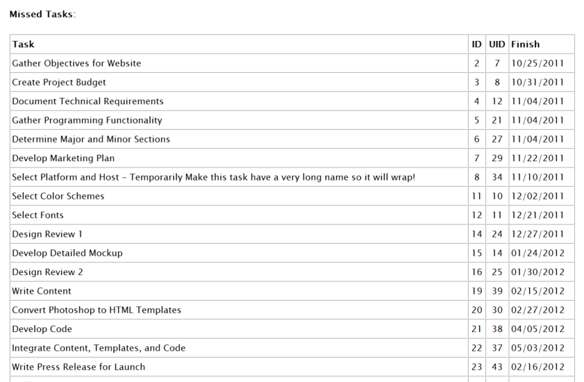 For quick reference, the task name and UID are typically included plus any fields that are relevant to the calculation.