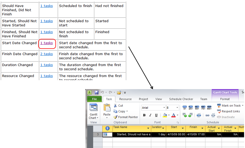 After the Summary table comes the detail task tables. These tables list the tasks matched by each category, with columns that list exactly what changed for the task between Schedule 1 and Schedule 2.