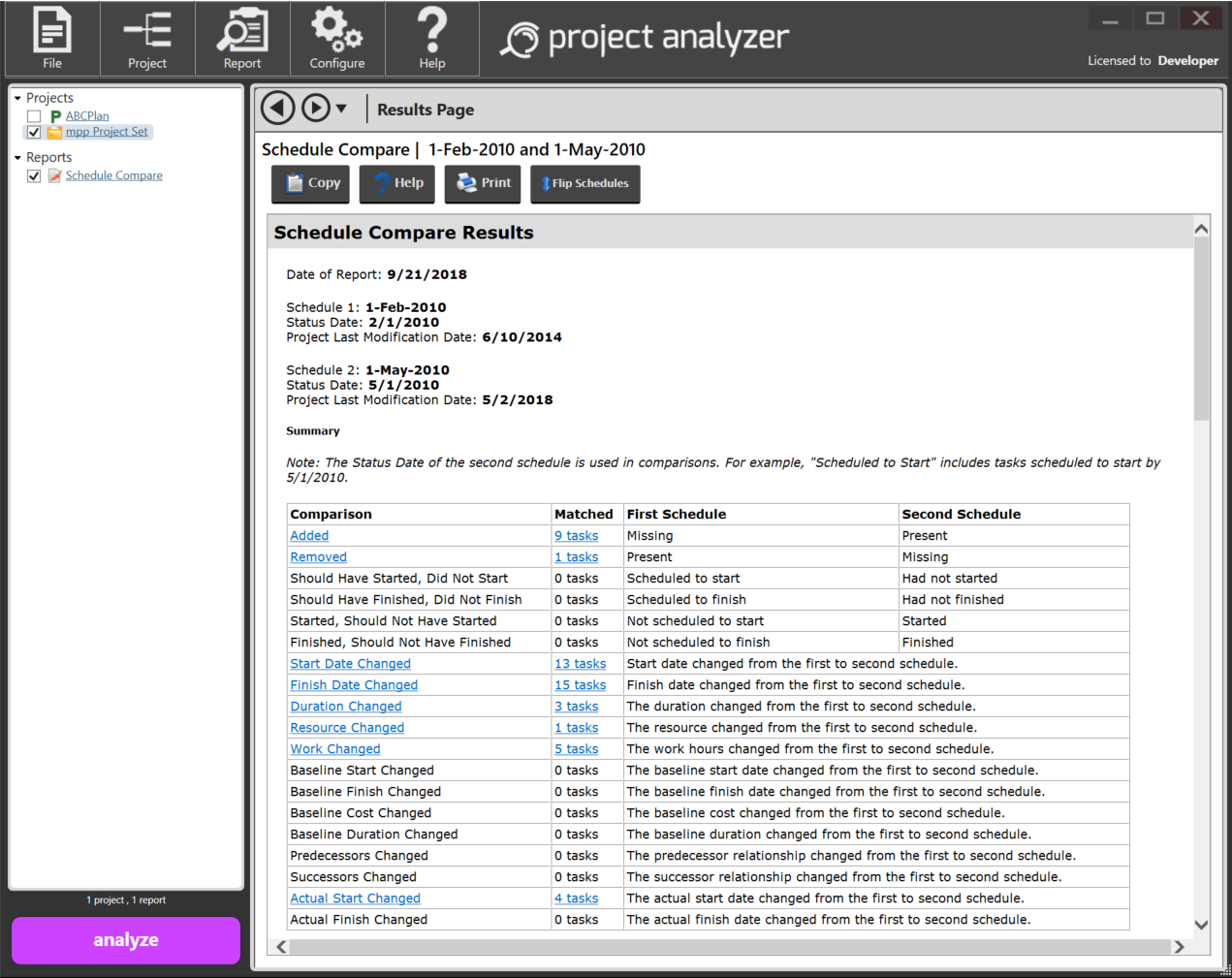 The report begins by showing which schedule is considered to be Schedule 1 (the baseline), and which is Schedule 2 (the revised). You should always make sure that the schedules are in the correct order. If the schedules are backwards (Schedule 1 should be Schedule 2 and vice versa), click the Flip Schedules button.