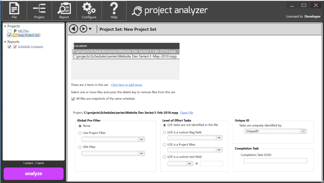Select the project set containing the two projects to compare from the Projects heading by checking the box to its left. Then, select the newly created Schedule Compare report from the Reports heading, and click Analyze.
